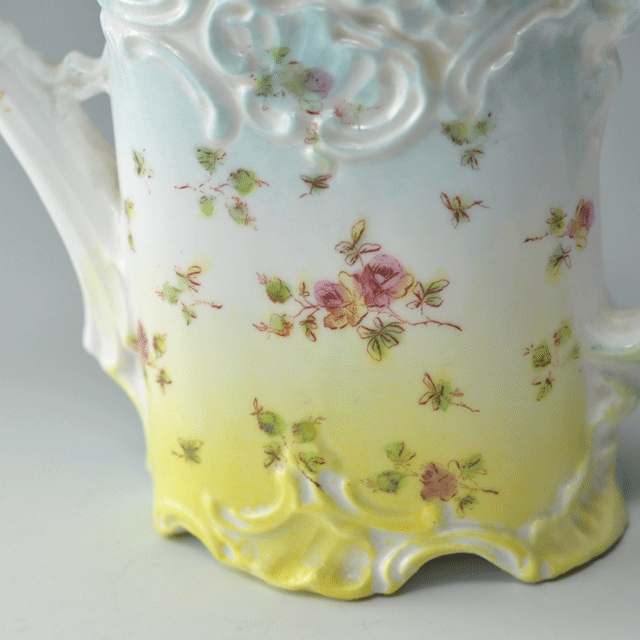 とても珍しいヴィクトリア期のWatering Can。デコラティブな持ち手と、淡いブルー&イエローのグラデーションが何ともいえない美しさです。小さなティーポット位の大きさですので、お花の水やりにはもちろん、花器としてお使い頂くのも素敵です。