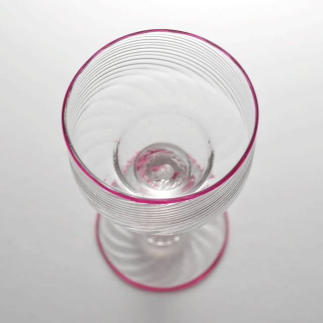 ヴェネチアンの細工が美しい、1900年代のデザートワイングラス。上質なクリスタル製です。ハンドメイドの古いガラスならではの、味わい深いゆらぎと気泡が見受けられます。ワインはもちろん、ゼリーやシャーベットなどの器として使うのもお洒落です。